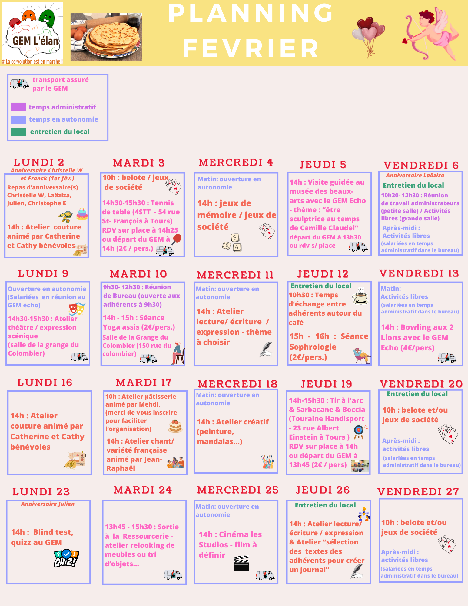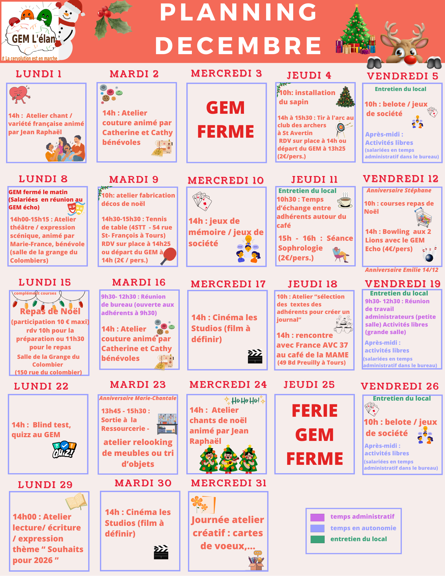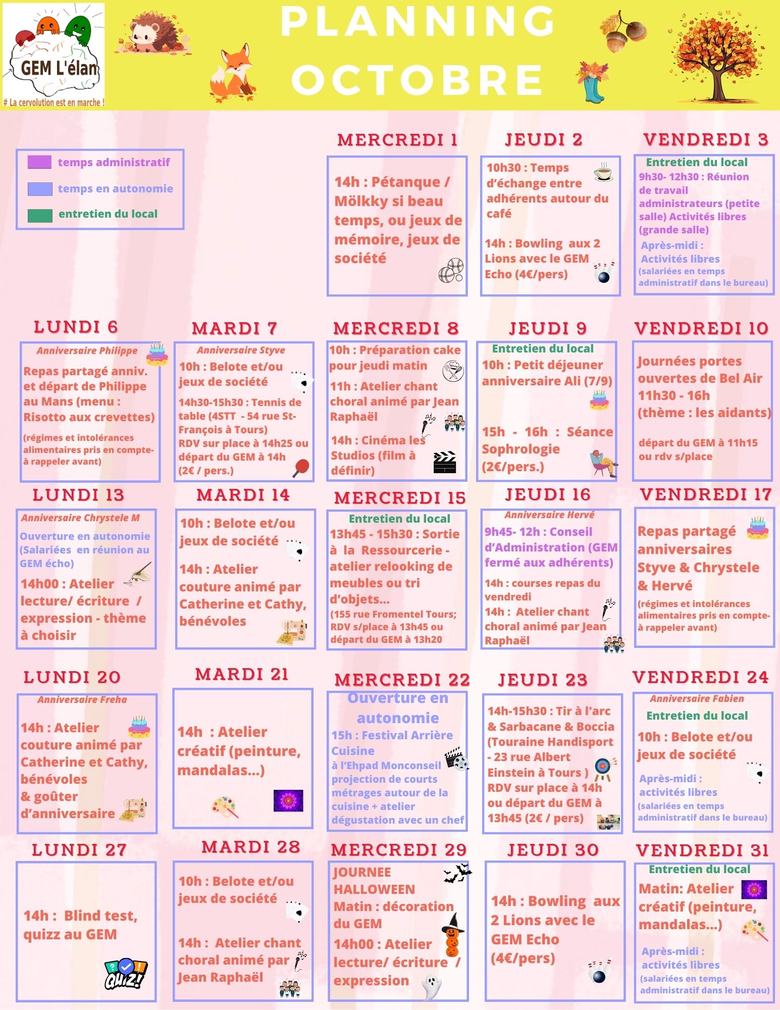 Attention ! Certaines activités doivent être réservées à l’avance pour y participer. Chaque activité est susceptible d’être modulée, reportée et/ou annulée en fonction des envies des adhérents.