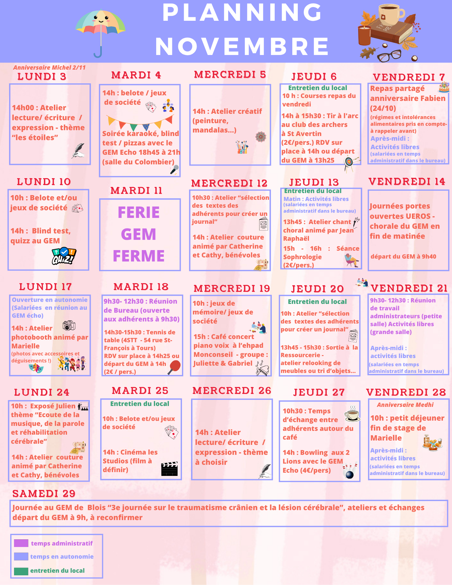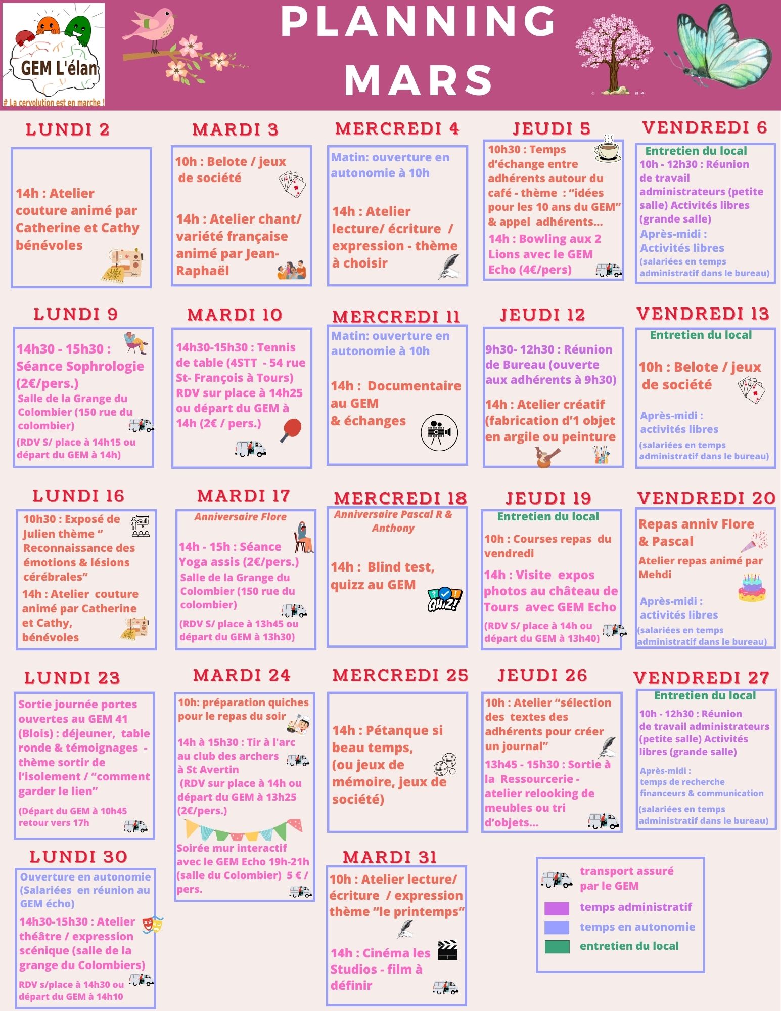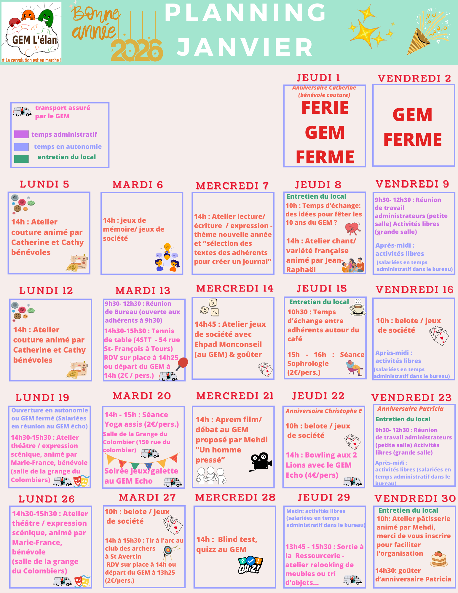 Attention ! Certaines activités doivent être réservées à l’avance pour y participer. Chaque activité est susceptible d’être modulée, reportée et/ou annulée en fonction des envies des adhérents.